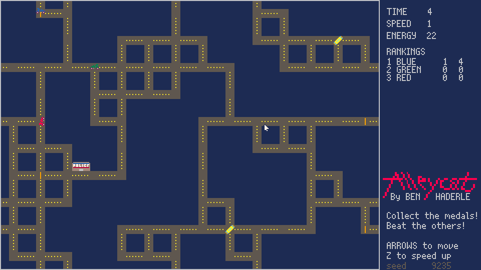 Alleycat is a Broughlike about racing bikes in a city. You play as the red bike. Try to collect all the medallions and not get caught!